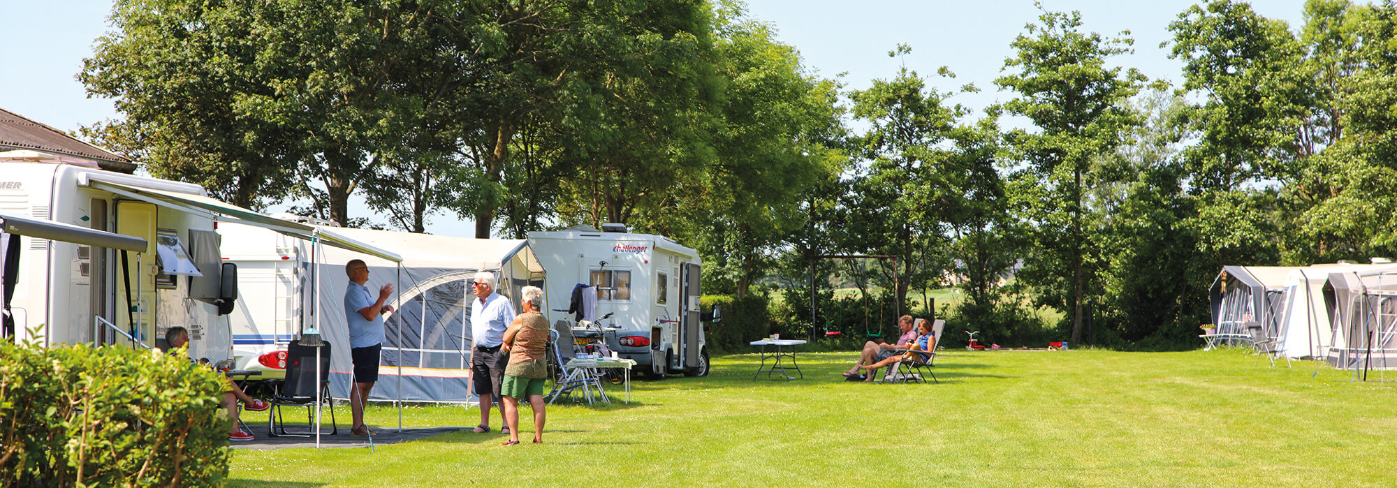 De buitenste rij kampeerplaatsen heeft uitzichtover de weilanden met grazende koeien.