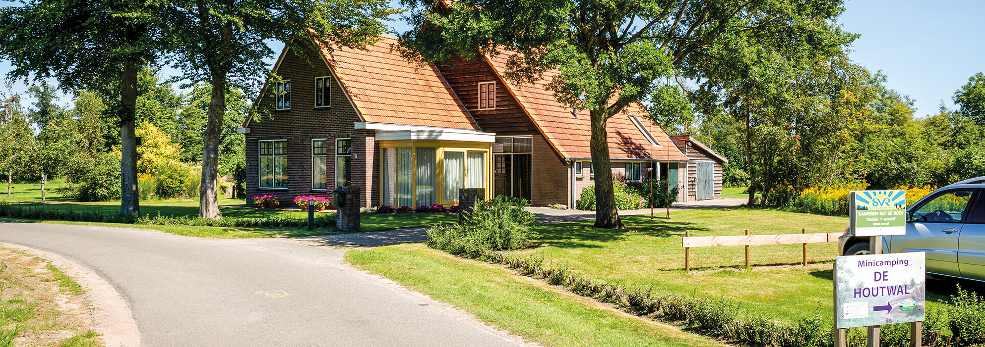 De naam De Houtwal heeft geen uitleg nodig, als we door het coulissenlandschap van het westen van Overijssel rijden. Zo hier en daar zien we nog zo’n natuurlijke afscheiding tussen weilanden en akkers. Het geeft een bepaald ritme aan het landschap waar we rustig van worden. Zo worden we geleidelijk voorbereid op de sfeer van de camping die zich aankondigt met een sobere entree. Geen schreeuwende vlaggen en vaandels, maar een eenvoudig bord. Het aantal parkeerplekken direct aan de weg duidt er ook op dat het hier om een minicamping gaat. We zien een sanitairgebouwtje en een chalet dat eruit ziet als receptie en vol staat en hangt met allerlei informatie over de omgeving. Daar willen we meer over weten, maar eerst maken we een rondgang over de kampeervelden.